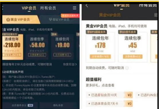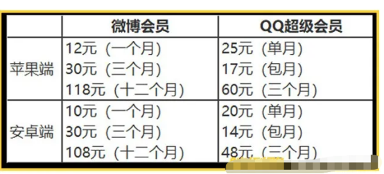 具体多付了多少钱呢?比如微博会员的服务分为1个月、3个月和12个月,安卓端的会员价分别为10元、30元和108元,苹果端的会员价分别为12元、30元和118元。