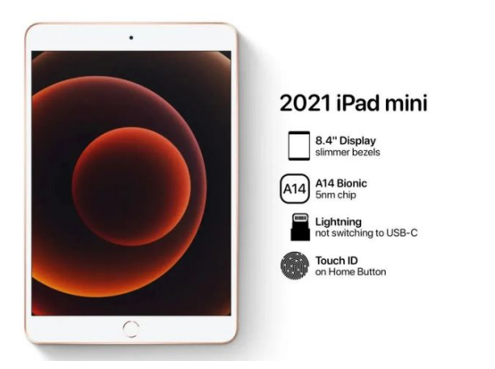 而新iPad mini据悉外观变化不大,依旧保留Home键、Lightning接口,只是屏幕稍微大一点,由原来的7.9英寸升级到8.4英寸。