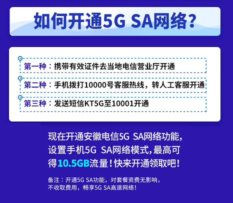 还有种更便捷的方法,只要在安徽电信微信公众号回复“5G SA”即可获取开通入口,用户成功升级SA并产生5G流量(5G登网)后还可参与抽奖,最高可抽中10.5 GB流量。