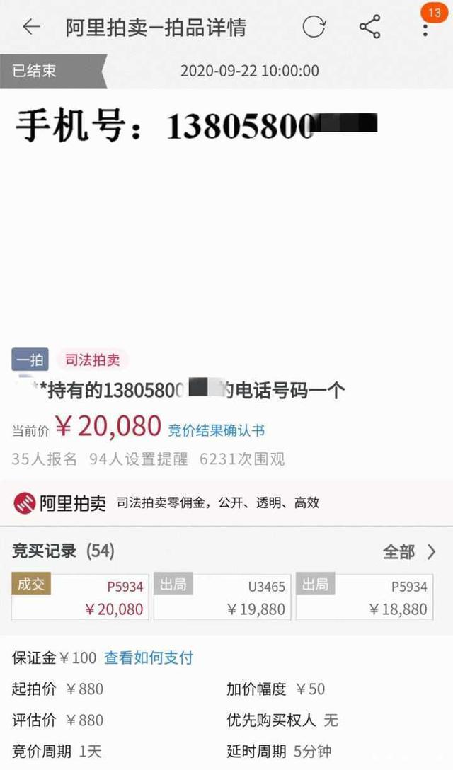 有网友声称:“看过司法拍卖房子、拍卖车子,昨天也看过司法拍卖柴犬的,说实话,我真没想到一个手机号码也是可以拍卖的。”